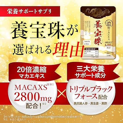 養宝珠は、1粒に2,800mgものマカを配合した画期的なサプリメントです。マカには滋養強壮やストレス緩和など様々な効果があることが知られています。さらに、トリプルブラックプラス配合により、より高い効果が期待できるのが特徴です。
